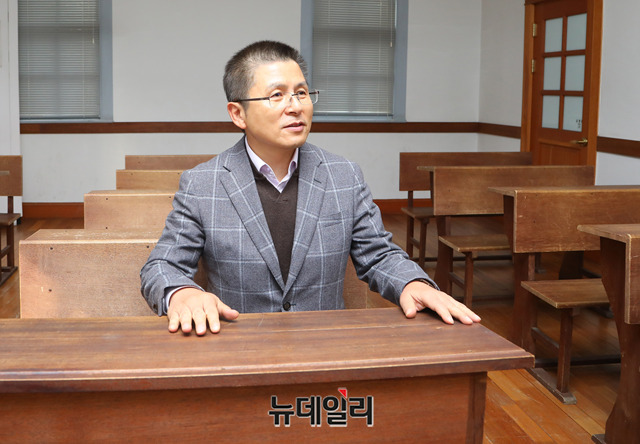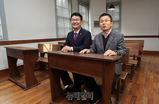 황교안 자유한국당 대표와 정용기 정책위의장이 12일 오후 서울 중구 배재학당 역사박물관에서 열린 '자유한국당 교육정책비전' 발표 기자회견에 앞서 배재학당 개교 당시의 모습을 재현한 체험교실 의자에 앉아있다.황 대표는 이날 "문재인 정부가 2025년부터 외국어고, 국제고, 자사고를 일괄폐지한다고 한다"며 "외국어고·국제고·자사고 일괄폐는 절대 불가하다"고 입장을 밝혔다. 이어 '정시 50% 이상 확대 정책'도 언급했다.이날 정책발표회에는 정용기 정책위의장과 주요당직자, 당 소속 교육위 의원들, 저스티스리그 이사위원 등 50여 명이 참석했다.