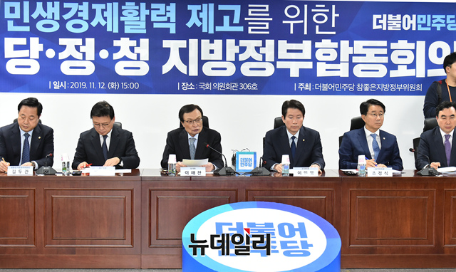 이해찬 더불어민주당 대표가 12일 오후 국회 의원회관에서 열린 민생경제활력 제고를 위한 당·정·청·지방정부 합동회의에 참석해 모두발언을 하고 있다.