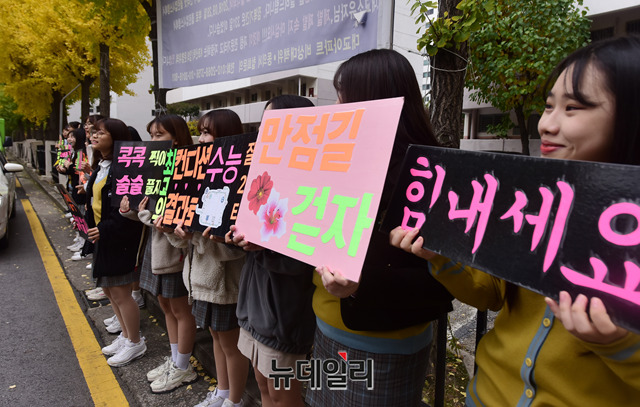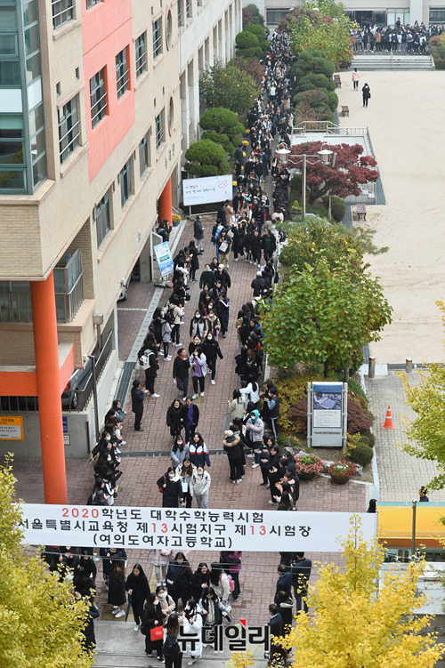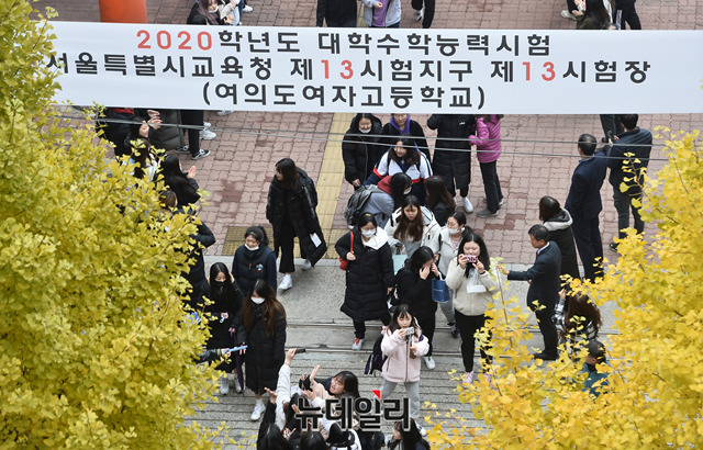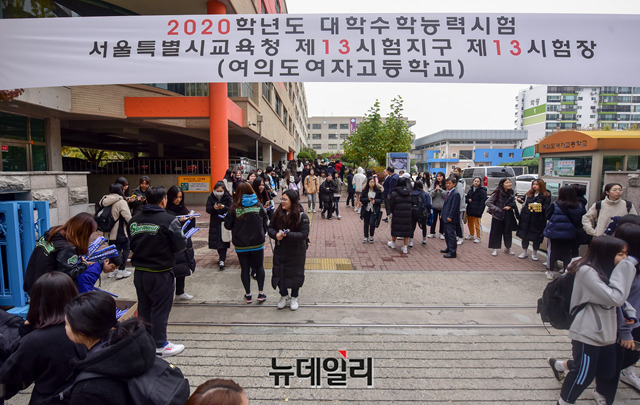 2020학년도 대학수학능력시험(수능)을 하루 앞둔 13일 오전 서울 여의도 여의도고등학교에서 여고 수험생들이 후배들에게 응원을 받고 있다.