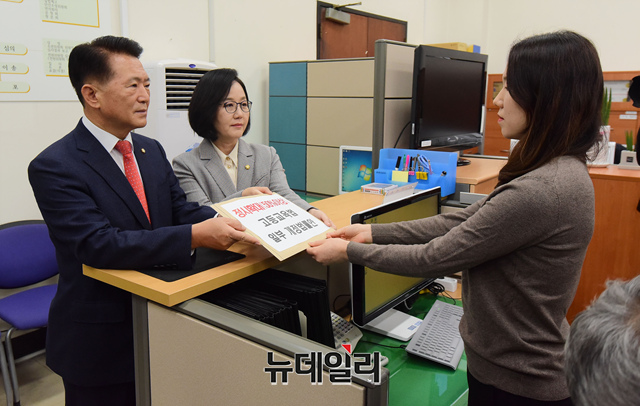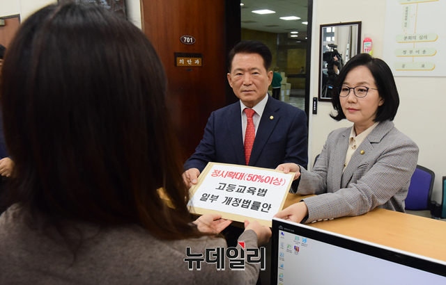김한표 자유한국당 교육위 간사와 김현아 교육위 의원이 13일 오전 국회 의안과에서 정시확대 50%가 포함된 고등교육법 개정법률안을 제출하고 있다.