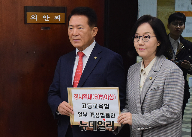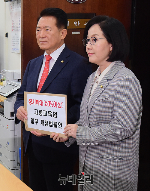김한표 자유한국당 교육위 간사와 김현아 교육위 의원이 13일 오전 국회 의안과에서 정시확대 50%가 포함된 고등교육법 개정법률안을 제출하기 위해 입장하고 있다.