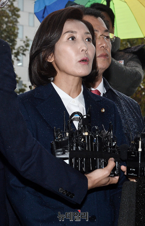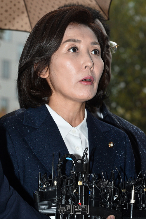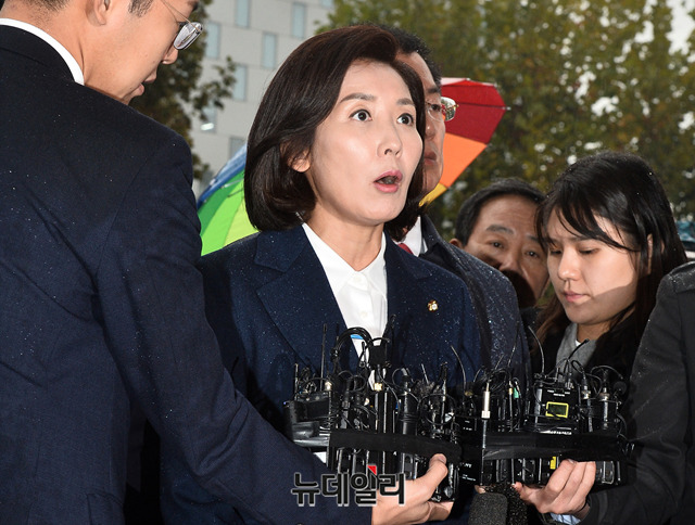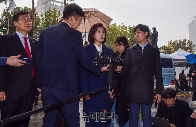 패스트트랙 지정 과정에서 일어난 충돌 관련 수사를 받기 위해 나경원 자유한국당 원내대표가 13일 오후 서울 양천구 서울남부지방검찰청으로 출석하며 취재진의 질문에 답하고 있다.