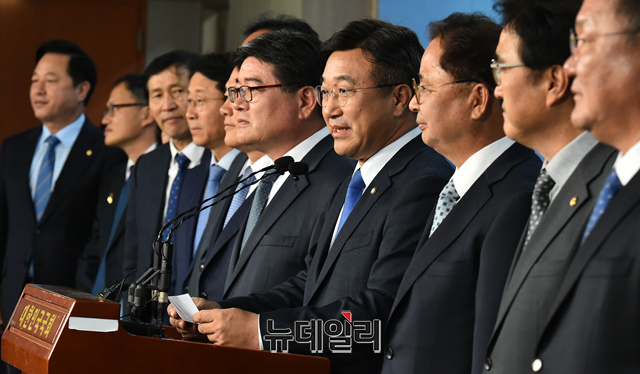 윤호중 더불어민주당 총선기획단장이 13일 오후 국회 정론관에서 열린 김용진 전 기획재정부 제2차관, 김학민 전 순천향대학교 산학협력부총장, 황인성 전 민주평화통일자문회의 사무처장 입당 기자회견에서 소개를 하고 있다.