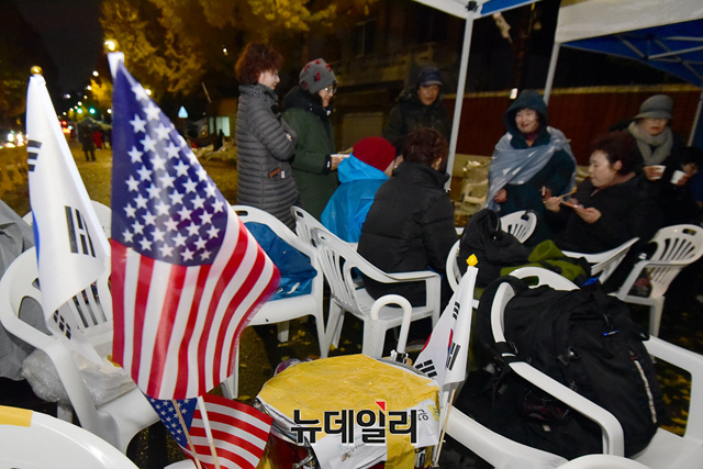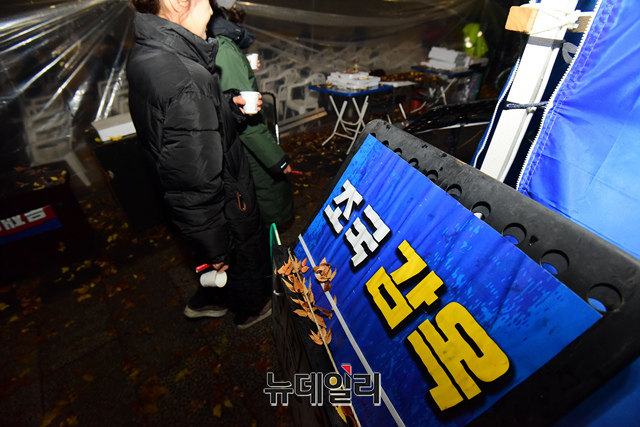 이날 오후 내내 비가 내렸지만 200여 명이 비속에서 농성을 지켰다. 서울은 올가을 들어 첫 한파 특보가 발효됐다.