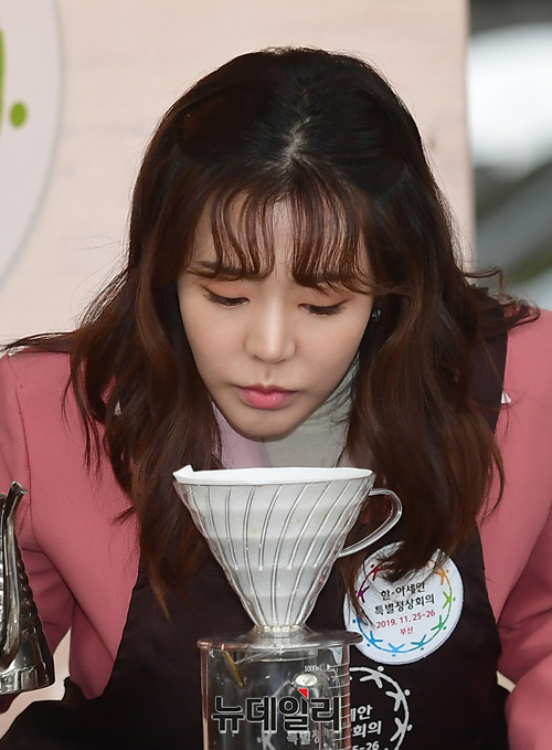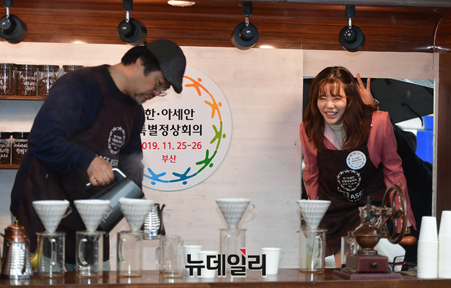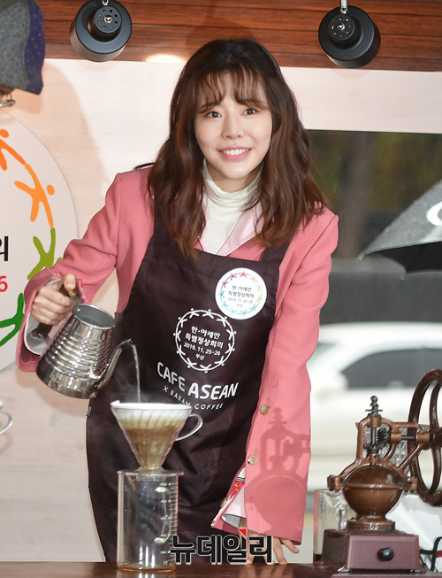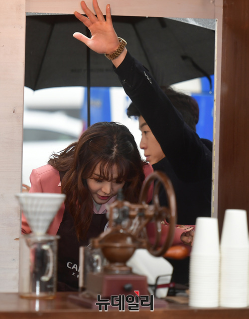 소녀시대 멤버 써니가 15일 오전 서울 중구 서울광장에서 '카페 아세안 써니 데이'를 주제로 열린 커피트럭 이벤트에 일일 바리스타로 참여해 커피를 내리고 있다.
