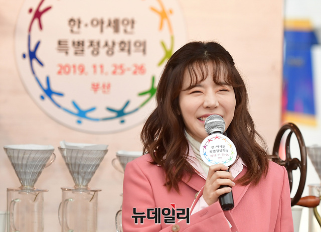 소녀시대 멤버 써니가 15일 오전 서울 중구 서울광장에서 '카페 아세안 써니 데이'를 주제로 열린 커피트럭 이벤트에 일일 바리스타로 참석해 비가 내리자 하늘을 보고 있다.