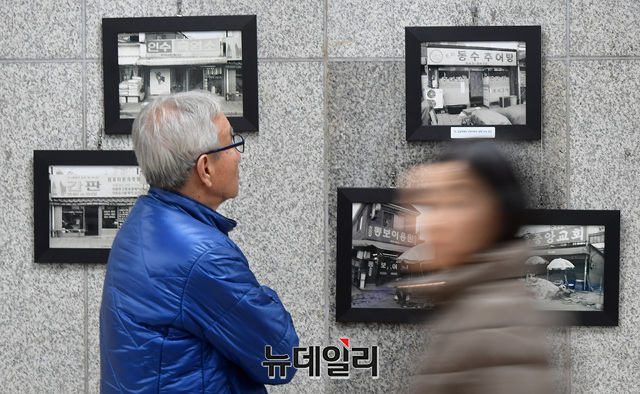 길음역을 지나는 시민들이 15일 오후 서울 성북구 길음역에서 개막한 '길음1동 거리 사진 전시회'를 살펴보고 있다.'옛날 우리 동네는...'을 주제로 오픈한 사진전은 서울 성북구 길음동 뉴타운 개발이 시작된 2002년 7월부터 2003년 7월까지 거리를 담은 사진 66점을 전시한다.사진은 당시 인수파출소장이었던 나영범 씨가 기록했다. 12월 13일까지 길음역 7번 출입구 복도에 전시된다.