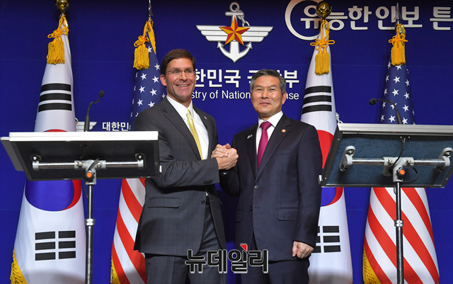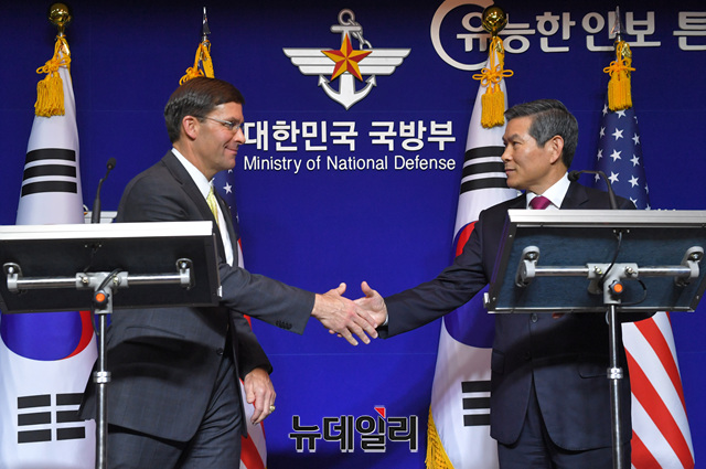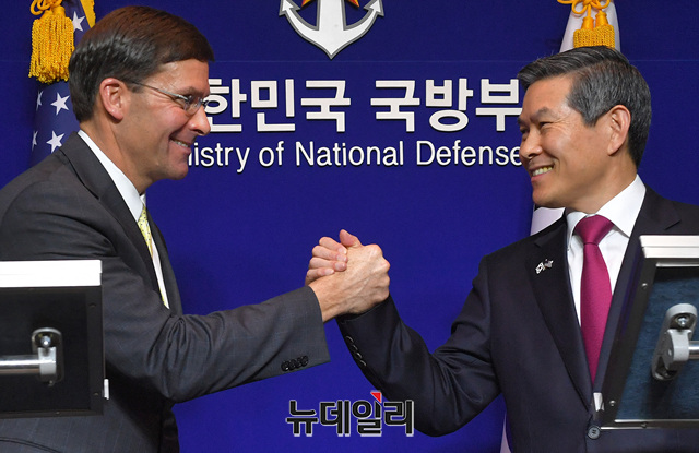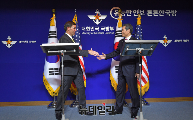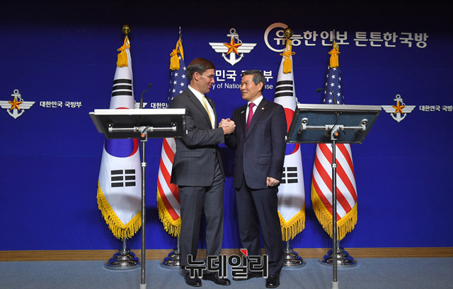 정경두 국방장관과 '마크 에스퍼' 미국 국방장관이 15일 오후 서울 용산구 국방부에서 열린 제51차 한미안보협의회(SCM) 공동 기자회견에서 기념촬영을 하고 있다. (사진=공동취재단)
