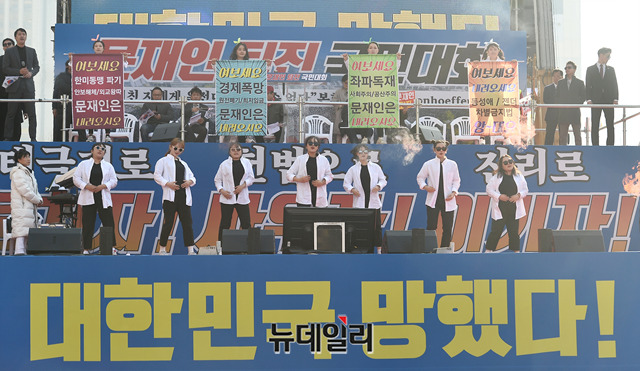 문재인 퇴진을 촉구하는 청년들이 16일 오후 서울 광화문 광장에서 열린 '문재인 퇴진 국민대회'에서 공연을 하고 있다.