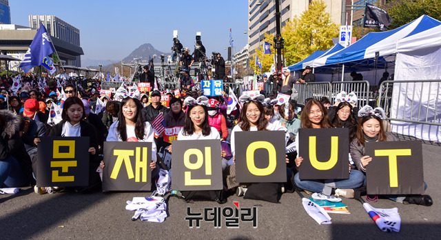 문재인하야범국민투쟁본부가 주최하는 국민대회는 지난 10월 3일에 시작해 6번째 열리고 있다. 주최측에 따르면 10만여 명이 참가했다.