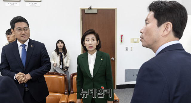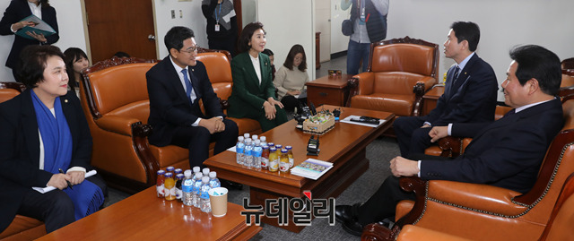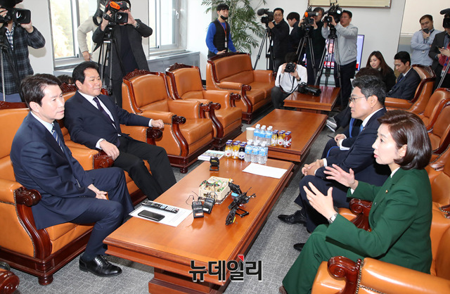 나경원 자유한국당 원내대표, 이인영 더불어민주당 원내대표, 오신환 바른미래당 원내대표가 18일 오전 국회 운영위원장실에서 정례 회동을 갖고 있다.