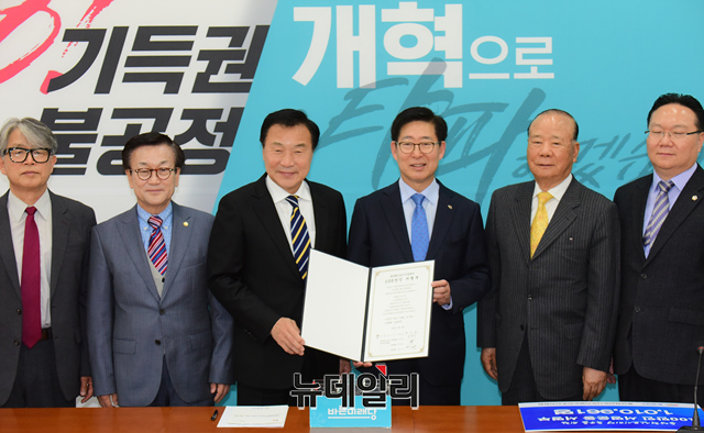 손학규 바른미래당 대표가 18일 오전 국회를 예방한 양승조 충남도지사 및 관계자들과 기념촬영을 하고 있다.
