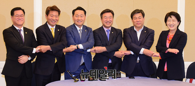 이기우 국회의장 비서실장 정의당 여영국, 바른미래당 김관영, 더불어민주당 윤호중, 자유한국당 김선동, 민주평화당 박주현 의원이 18일 오후 국회 귀빈식당에서 열린 정치협상회의 실무모임에서 손을 맞잡고 있다.