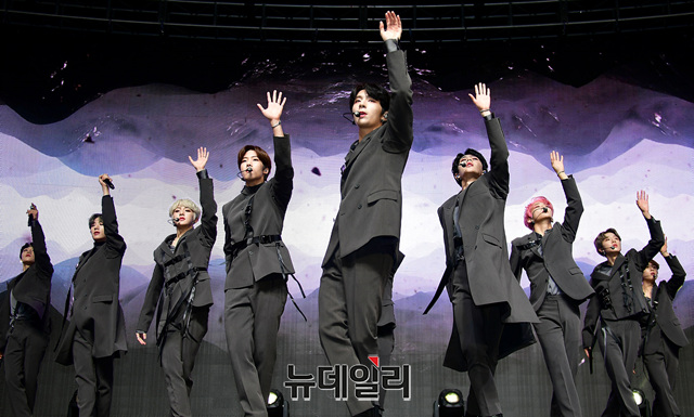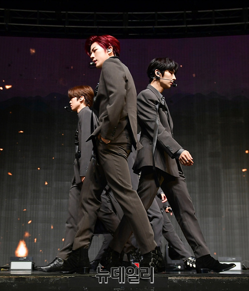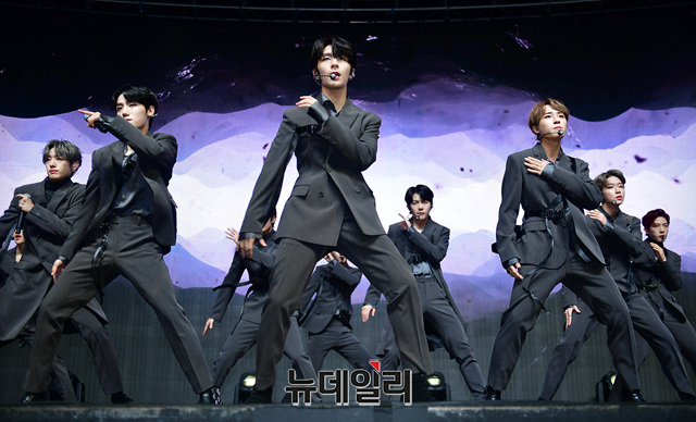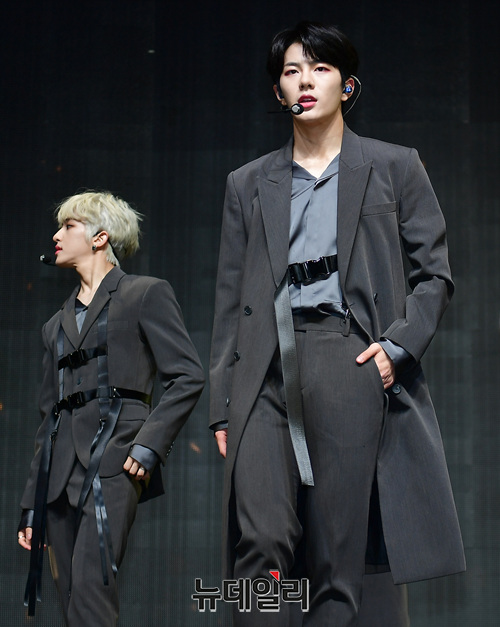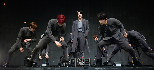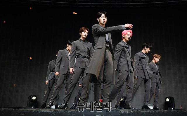 10인조 아이돌그룹 골든차일드가 18일 오후 서울 광진구 예스24 라이브홀에서 열린 첫 정규앨범 '리부트(Re-boot)' 쇼케이스에서 수록곡 무대를 선보이고 있다.
