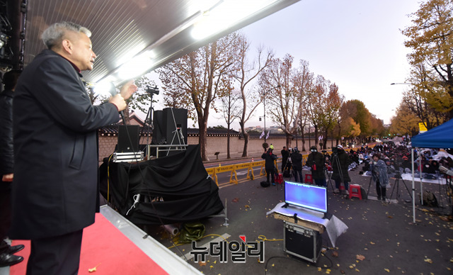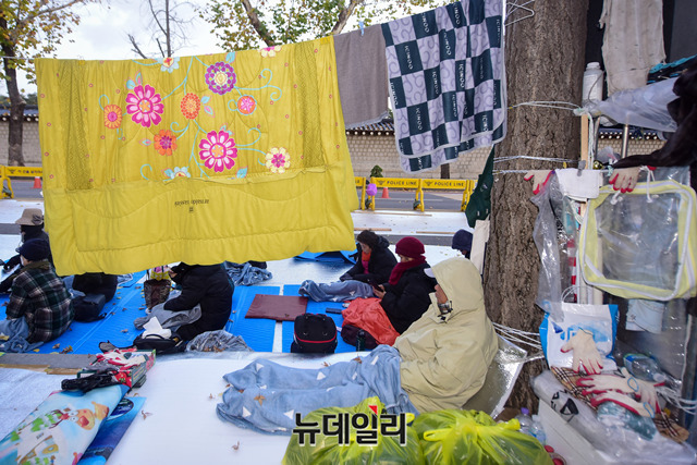 '문재인 퇴진'을 요구하며 청와대 철야농성장을 찾은 시민들이 한파주의보가 발령된 18일 오후에도 퇴진을 촉구하며 농성을 이어가고 있다. 이날은 철야농성 47일째다.