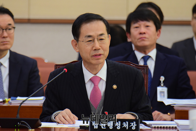 조재연 법원행정처장이 19일 오전 국회에서 열린 법제사법위원회 전체회의에 참석해 의원들의 질문에 답하고 있다.