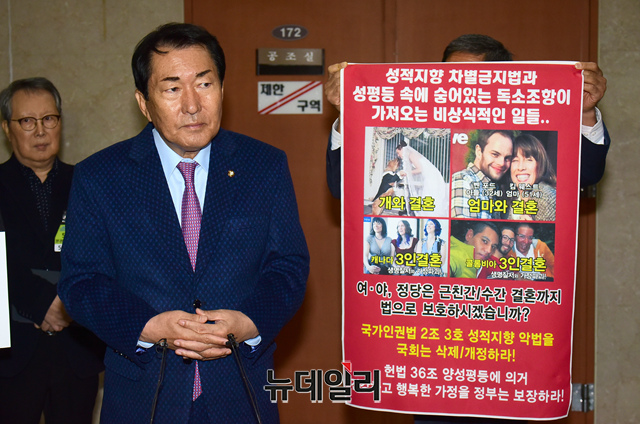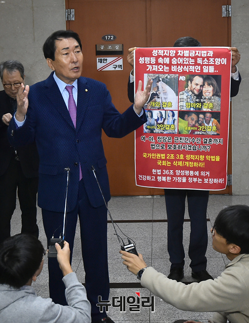 안상수 자유한국당 의원과 기독교 단체 관계자들이 19일 오전 국회 정론관에서 안 의원이 발의한 국가인권위원회법 개정안 관련 기자회견을 미친 후 입법취지를 설명하고 있다.
