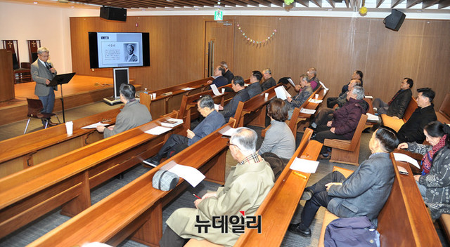 김철홍 장로회신학대학교 신약학 교수가 19일 오후 서울 중구 정동제일교회 아펜젤러홀에서 열린 제105회 이승만포럼에서 '우남 이승만의 기독교 개종과 기독교가 그의 정치사상에 준 영향'을 주제로 강연하고 있다.