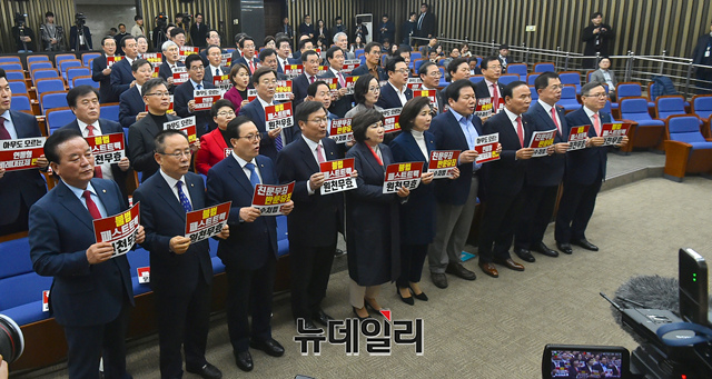 나경원 자유한국당 원내대표 등 소속 의원들이 19일 오후 국회에서 열린 의원총회에서 불법 패스트트랙 원천무효 구호를 외치고 있다.