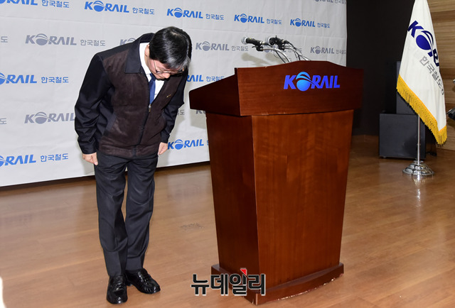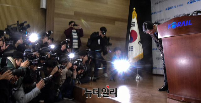 손병석 코레일 사장이 20일 오전 서울 용산구 코레일 서울본부에서 열린 기자회견에서 철도노조의 무기한 총파업 돌입과 관련해 대국민 사과를 하고 있다. 손 사장은 노사협상의 진행과정과 협의점을 밝히고, 향후 수송대책과 추가 협상 방안 등을 제시했다.