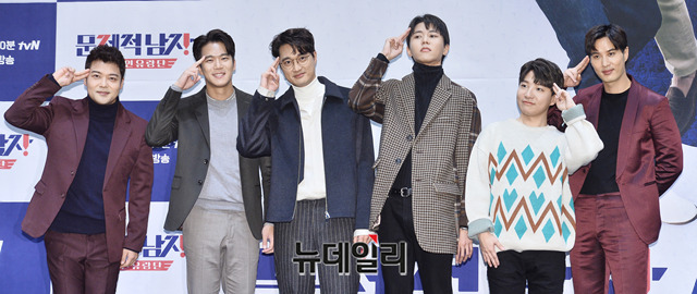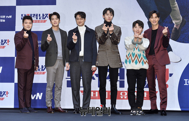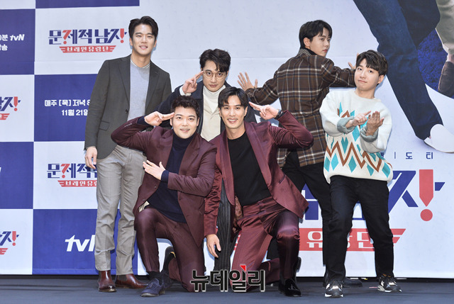 아나운서 전현무, 배우 하석진, 가수 이장원, 모델 주우재, 유튜버 도티, 배우 김지석이 20일 오후 서울 구로구 라마다 서울신도림에서 열린 tvN 예능프로그램 '문제적 남자(연출 박현주)' 제작발표회에서 포토타임을 갖고 있다.