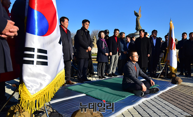 황교안 자유한국당 대표가 20일 오후 청와대 앞 분수대광장에서 문재인 정부의 총체적 국정실패와 관련해 △지소미아(GSOMIAㆍ한일 군사정보보호협정) 파기 철회 △고위공직자범죄수사처법 포기 △연동형 비례대표제 선거법 철회 등을 요구하며 무기한 단식 투쟁에 들어갔다. 황 대표는 자리를 옮겨 국회에서 투쟁을 이어갈 예정이다.