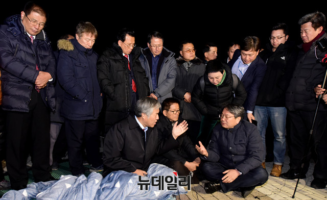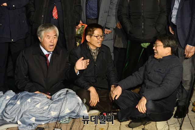 강기정 청와대 정무수석과 전광훈 한국기독교총연합회 대표회장이 20일 오후 청와대 앞 분수대에서 진행되고 있는 황교안 자유한국당 대표의 단식투쟁 현장을 찾은 뒤 '지소미아(GSOMIAㆍ한일 군사정보보호협정)' 관련 대화를 나누고 있다.