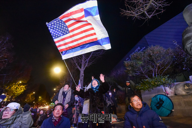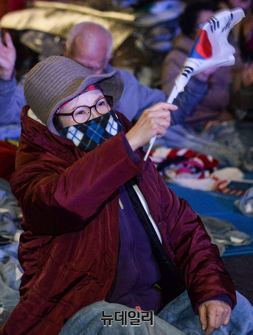 '문재인 퇴진'을 요구하며 청와대 철야농성장을 찾은 시민들이 17일 오후 국기를 흔들며 예배를 하고 있다. 이날은 철야농성 49일째 맞는날이다.