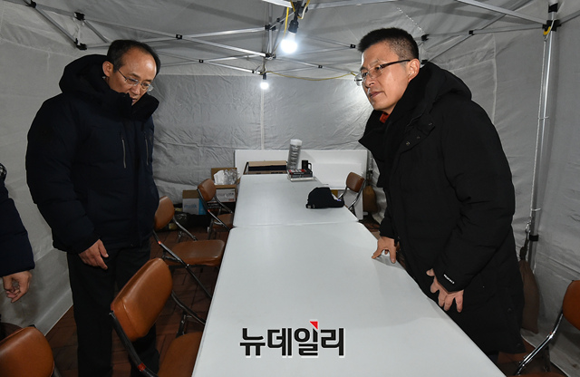 황 대표는 '지소미아 파기 철회, 공수처 설치법 포기, 연동형 비례대표제 선거법 철회'를 요구하며 단식투쟁을 시작했다.