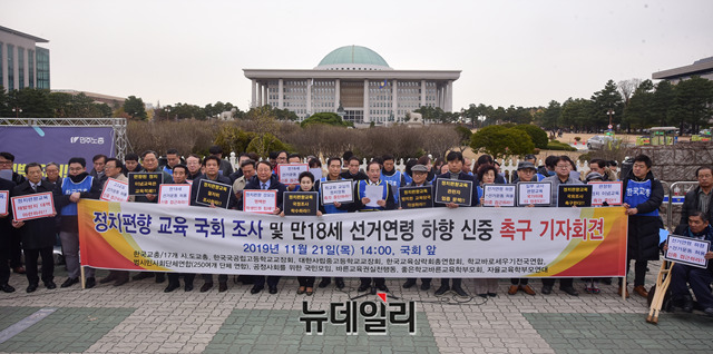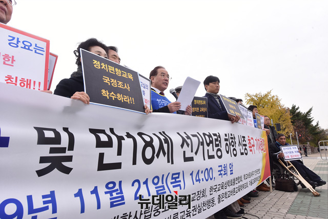 하윤수 한국교원단체총연합회 회장과 회원들이 21일 오후 국회 정문 앞에서 △정치편향 교육 국회 차원 조사 △18세 선거연령 하향 신중 추진 △검찰 및 경찰의 고발사건에 대한 신속하고 철저한 수사 △교육당국의 정치편향 교육에 대한 엄정한 조치와 근절대책 마련 등을 요구하는 기자회견을 갖고 있다.