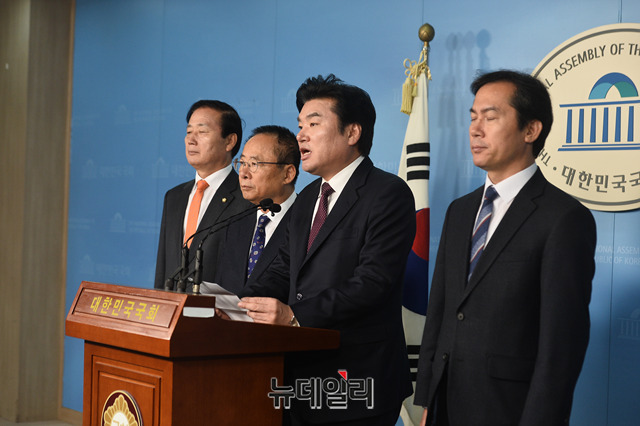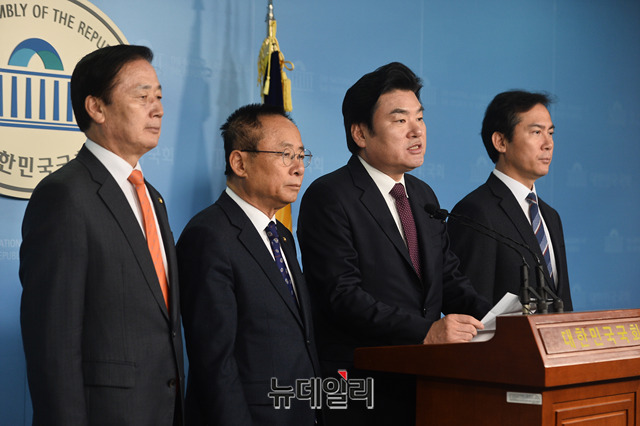 자유한국당 북핵외교안보특위 위원들(왼쪽부터 김성찬 의원, 이주영 의원, 원유철 의원, 김영우 의원)이 21일 오후 국회 정론관에서 기자회견을 갖고, 지소미아 파기 반대를 촉구하고 있다.