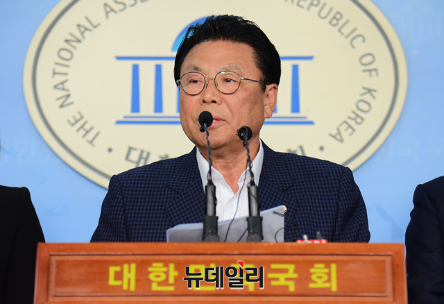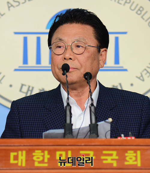 박맹우 자유한국당 총선기획단장이 21일 오전 국회 정론관에서 총선기획단 회의 결과 브리핑을 하고 있다.