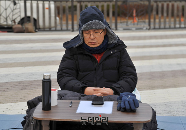 황교안 자유한국당 대표가 21일 오후 청와대 앞 분수대에서 이틀째 단식 투쟁을 이어가고 있다.황 대표는 20일 오후 3시부터 청와대 앞 분수대 광장에서 △지소미아(GSOMIAㆍ한일 군사정보보호협정) 파기 철회 △고위공직자범죄수사처법 포기 △연동형 비례대표제 선거법 철회 등을 요구하며 무기한 단식 투쟁에 들어갔다.단식투쟁은 청와대 앞에서 진행될 예정이었지만 경호상 이유 등으로 천막 설치가 불허되자 밤늦게 국회 본청 앞에 마련된 천막으로 이동해 단식을 이어갔다.