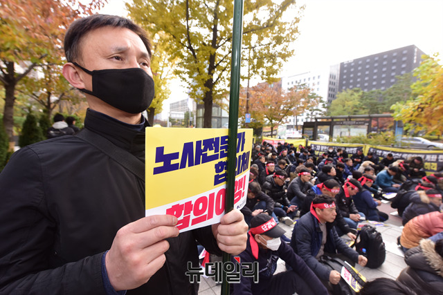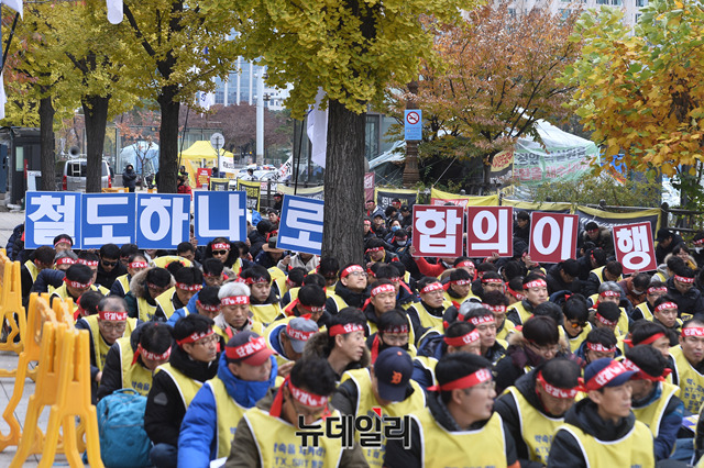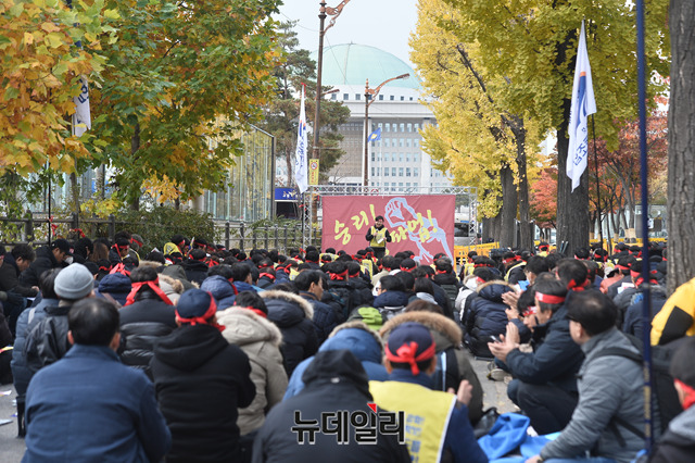 민노총 산하 철도노조가 총파업 이틀째인 21일 오후 국회 앞에서 4조 2교대 인력충원, 임금 인상 등을 요구하며 결의대회를 갖고 있다.