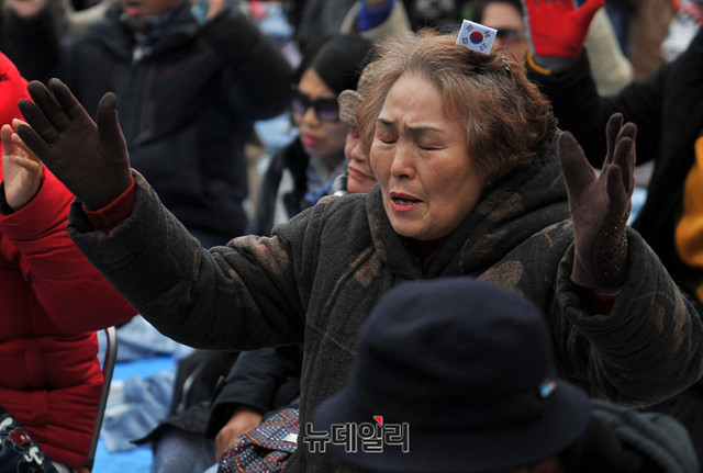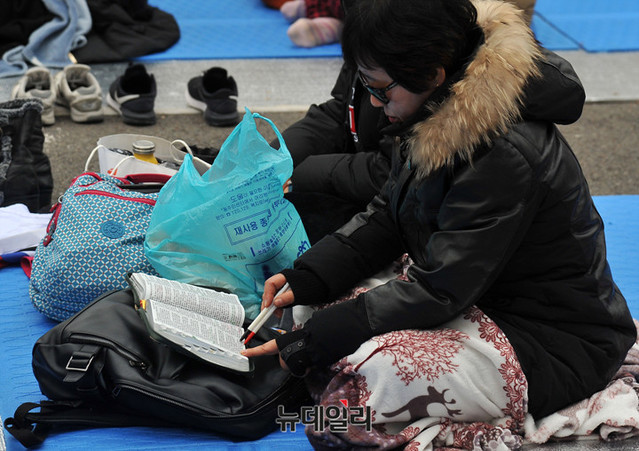 '문재인 퇴진'을 요구하며 청와대 철야농성장을 찾은 시민들이 21일 오후 예배를 하고 있다. 철야농성은 오늘로 50일째를 맞았다. 예배는 매일 오전 11시, 오후 4시, 오후 8시에 진행된다.