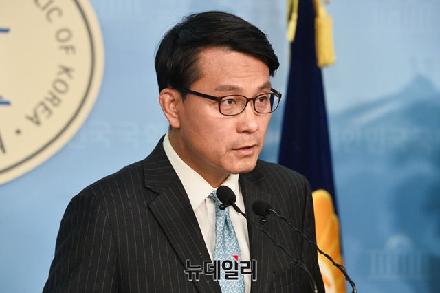 자유한국당 소속 윤상현 외교통일위원회 위원장이 22일 오전 국회 정론관에서 '한일군사정보보호협정(지소미아·GSOMIA)' 종료 철회 촉구 기자회견을 갖고 있다.