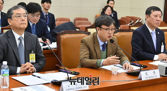 국립공공의료대학 설립 관련 법률 제정에 관한 공청회가 22일 오전 국회 보건복지위원회에서 열린 가운데 안덕선 고려대학교 교수, 임준 서울시립대학교 교수, 조승연 전국지방의료원연합회장이 의원들의 질문에 답하고 있다.