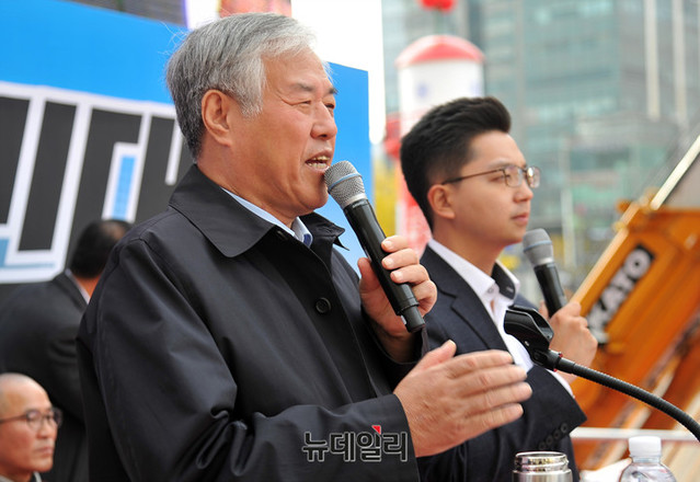 전광훈 한국기독교총연합회 회장이 23일 오후 서울 광화문 광장에서 열린 '문재인 퇴진 국민대회'에서 대회사를 하고 있다.