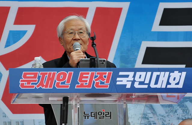 조갑제 조갑제닷컴 대표가 23일 오후 서울 광화문 광장에서 열린 '문재인 퇴진 국민대회'에서 혁명공약 선포를 통해 "한국에 찾아온 위기를 극복해 자유통일을 이뤄내보자"고 말했다.