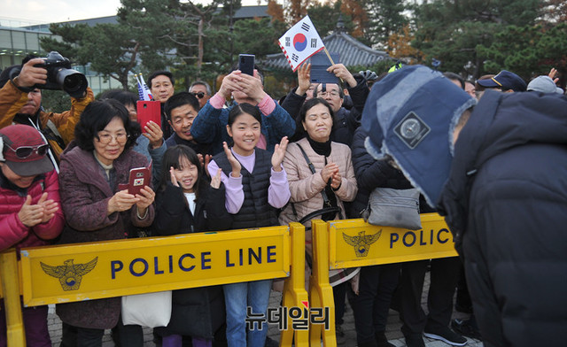 황교안 자유한국당 대표가 23일 오후 서울 청와대 앞 분수대 광장에서 4일차 단식투쟁 중 지지자들과 인사를 나누고 있다.