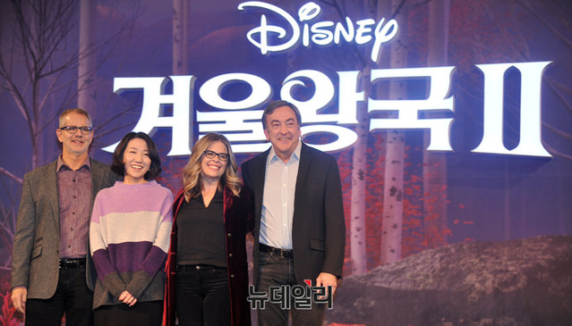 크리스 벅 감독, 이현민 수퍼바이저, 제니퍼 리 감독, 피터 델 베초 프로듀서가 25일 오전 서울 종로구 포시즌스호텔 서울에서 열린 애니메이션 '겨울왕국2' 내한 기자간담회에서 포즈를 취하고 있다.'겨울왕국2'는 2014년 개봉해 누적 관객 수 1,029만 명을 기록한 '겨울왕국'의 속편이다. 캐릭터들이 세상으로 나가 자신의 위치를 찾고 옳은 선택을 해야 하는 고군분투를 그린 담은 이야기. 11월 21일 개봉해 나흘만에 누적 관객 수 443만 명을 기록했다.
