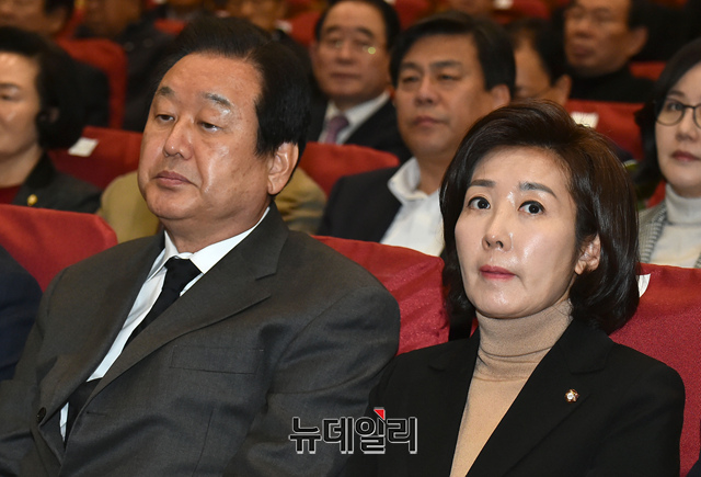 나경원 자유한국당 원내대표와 김무성 의원이 25일 오전 국회 의원회관에서 열린 김영삼 전 대통령 서거 4주기 기념행사에 참석해 대화를 나누고 있다.