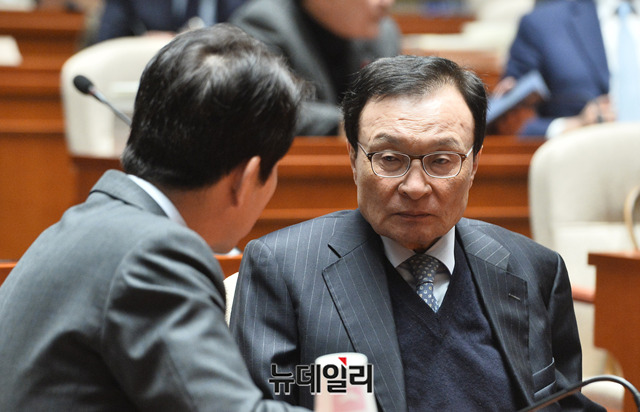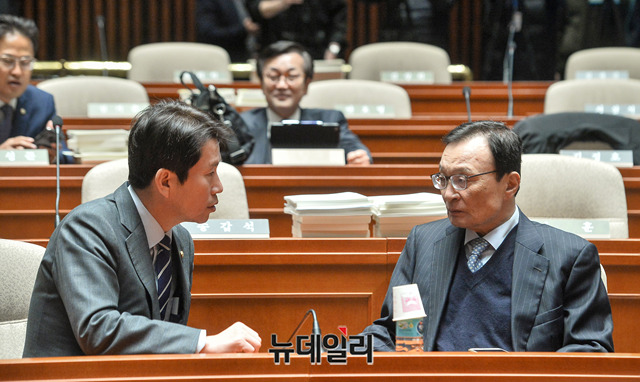 [포토] 민주당 의총, 대화하는 '이해찬-이인영'