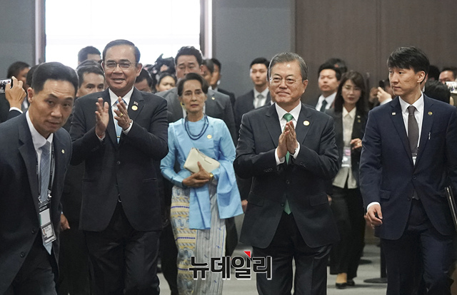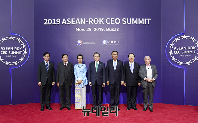 2019 한-아세안 특별 정상회의 CEO 서밋(Summit) 행사가 25일 부산 벡스코 2전시장에서 열린 가운데 문재인 대통령 등 참석자들이 기념촬영을 하고 있다. (왼쪽부터 성윤모 산업통상자원부 장관, 통룬 시술릿 라오스 총리, 아웅산 수치 미얀마 국가고문, 문 대통령, 쁘라윳 짠-오차 태국 총리, 박용만 대한상의 회장, 짐 로저스 로저스홀딩스 회장, 사진=청와대)