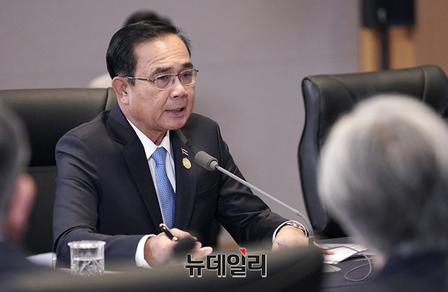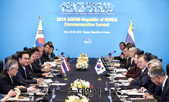 문재인 대통령이 25일 오전 부산에서 2019 한-아세안 특별정상회의에 참석한 쁘라윳 짠오차 태국 총리와 양자회담을 갖고 있다. (사진=청와대)