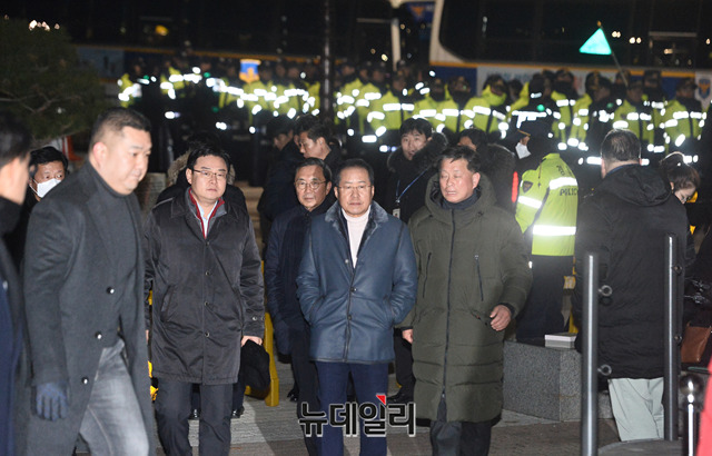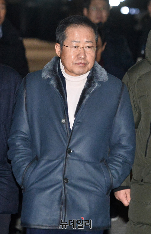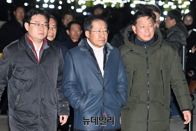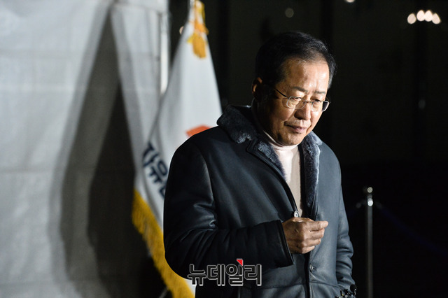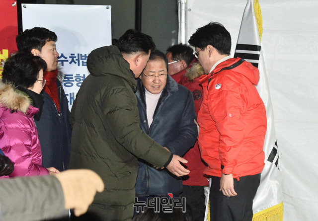홍준표 전 자유한국당 대표가 25일 오후 청와대 앞 분수대에서 6일째 단식투쟁인 황교안 자유한국당 대표의 단식천막을 찾아 위로방문을 마치고 천막을 나서고 있다.