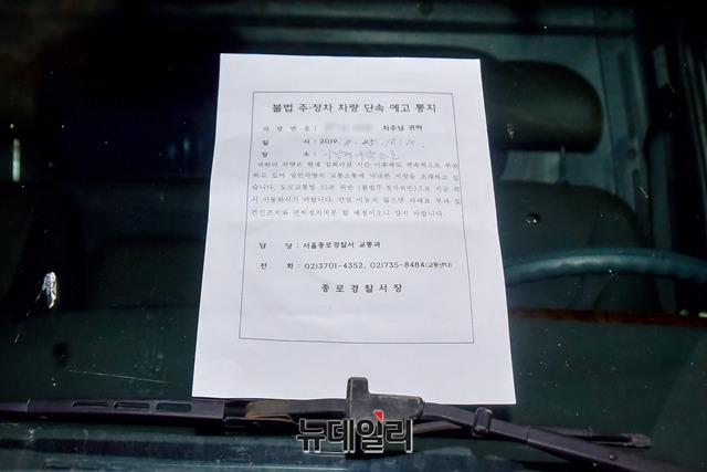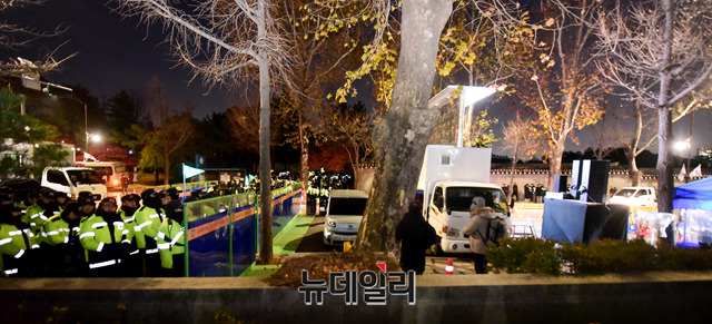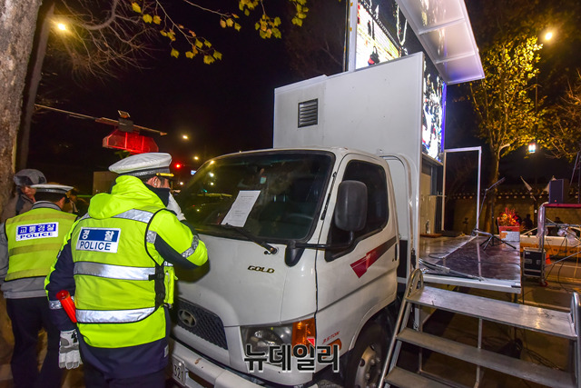 종로경찰서가 25일 오후 청와대 앞 철야농성장에 단상으로 활용중인 차량에 차량단속 통지서를 발부했다. 이날 경찰은 인근 주민들이 농성장 소음으로 인해 피해를 입고 있다며 저녁집회 불허 통지를 주최측에 했다.
