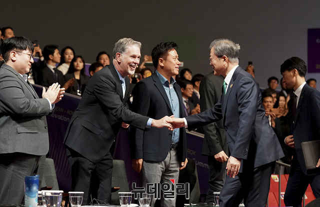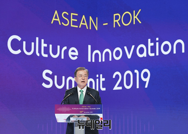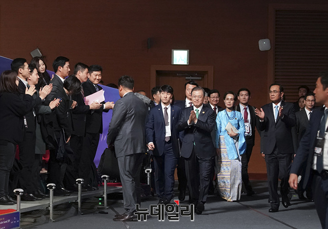 문재인 대통령이 25일 부산 벡스코에서 열린 2019 한-아세안 특별 정상회의 '문화혁신포럼' 행사에서 기념촬영을 하고 있다. (왼쪽부터 브라이언 차우 iME 대표, 아웅산 수치 미얀마 국가고문, 통룬 시술릿 라오스 총리, 쁘라윳 짠오차 태국 총리, 문 대통령, 방시혁 빅히트 엔터테인먼트 대표, 리드 헤이스팅스 넷플릭스 CEO, 박정호 SK텔레콤 사장, 피에르코팽 감독, 사진=청와대)