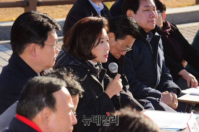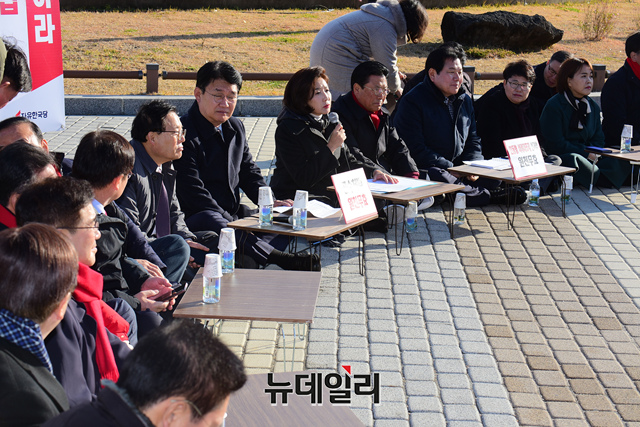 나경원 자유한국당 원내대표가 26일 오전 청와대 분수대 인근에 마련된 황교안 대표 단식농성장 앞에서 열린 원내대책회의에서 모두발언을 하고 있다.