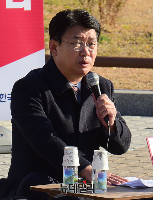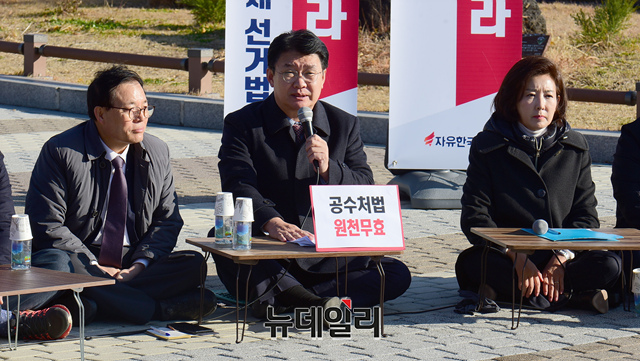 정용기 자유한국당 정책위의장이 26일 오전 청와대 분수대 인근에 마련된 황교안 대표 단식농성장 앞에서 열린 원내대책회의에서 모두발언을 하고 있다.